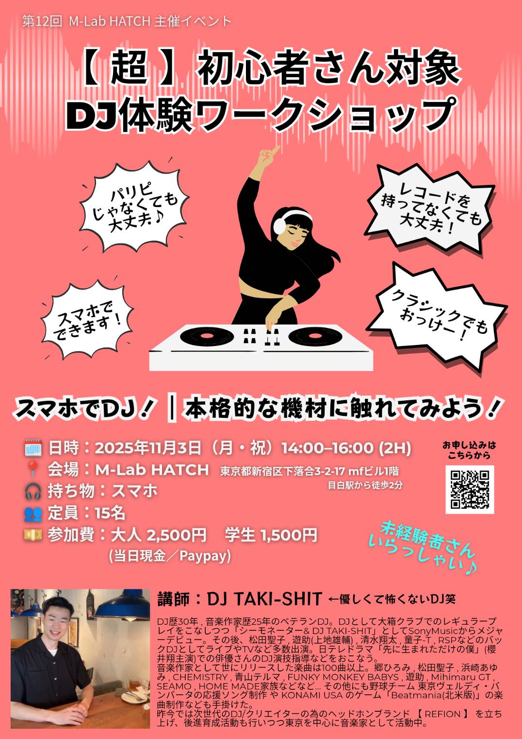 2025月11月3日(月・祝)「超初心者さん対象 DJ体験ワークショップ」(第12回 M-Lab HATCH 主催イベント)