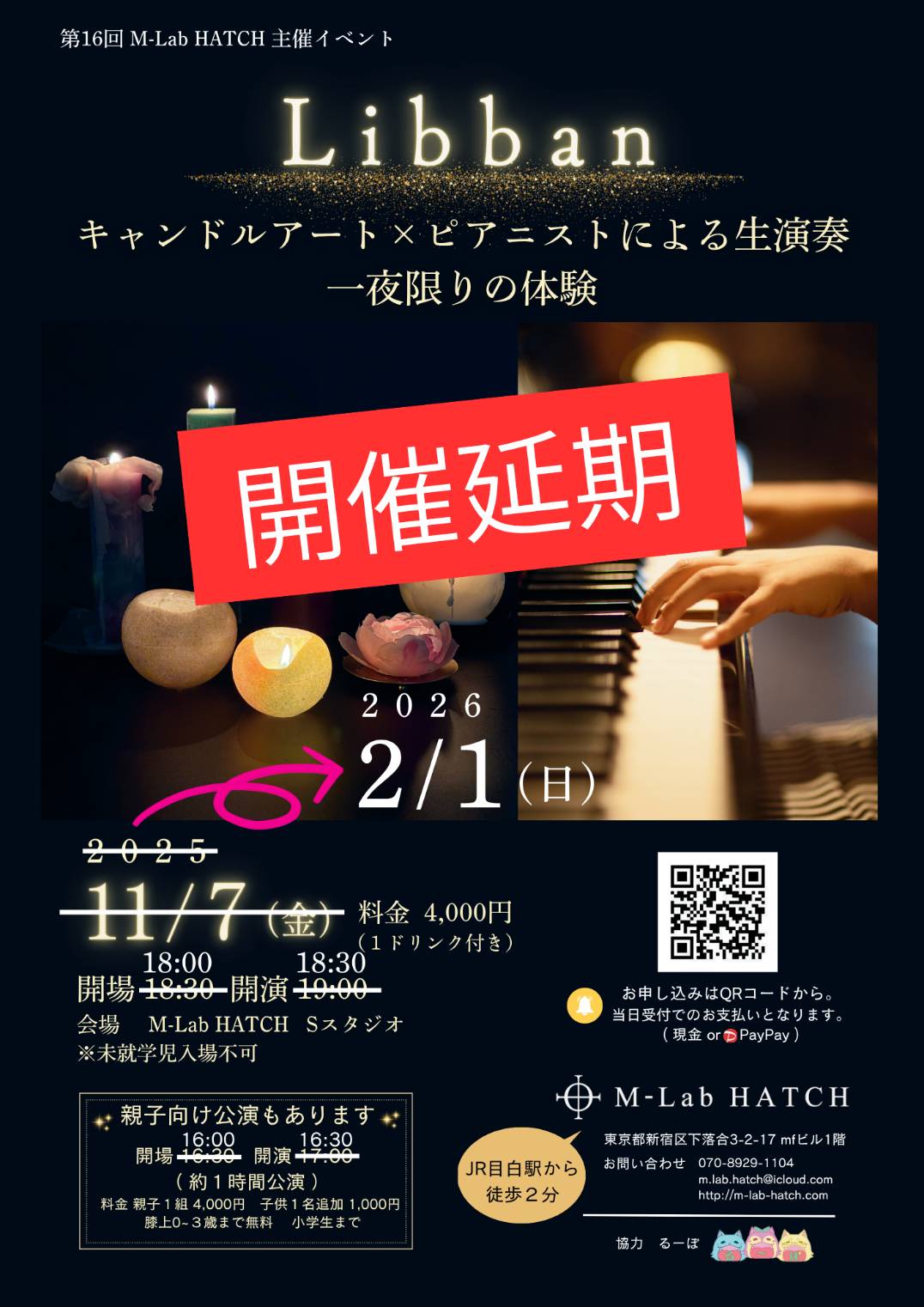 2025年11月7日(金)に開催を予定しておりました、キャンドルとピアノのコンサート「Libban」は、出演者の体調不良により開催を延期させていただきます。