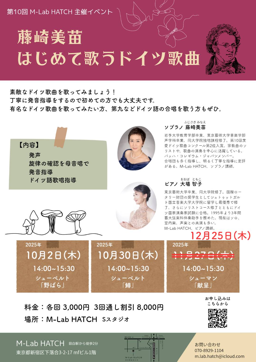 2025年11月27日(木)に開催を予定しておりました、「藤崎美苗 はじめて歌うドイツ歌曲」(シューマン「献呈」)講座は、講師の体調不良により開催を延期させていただきます。