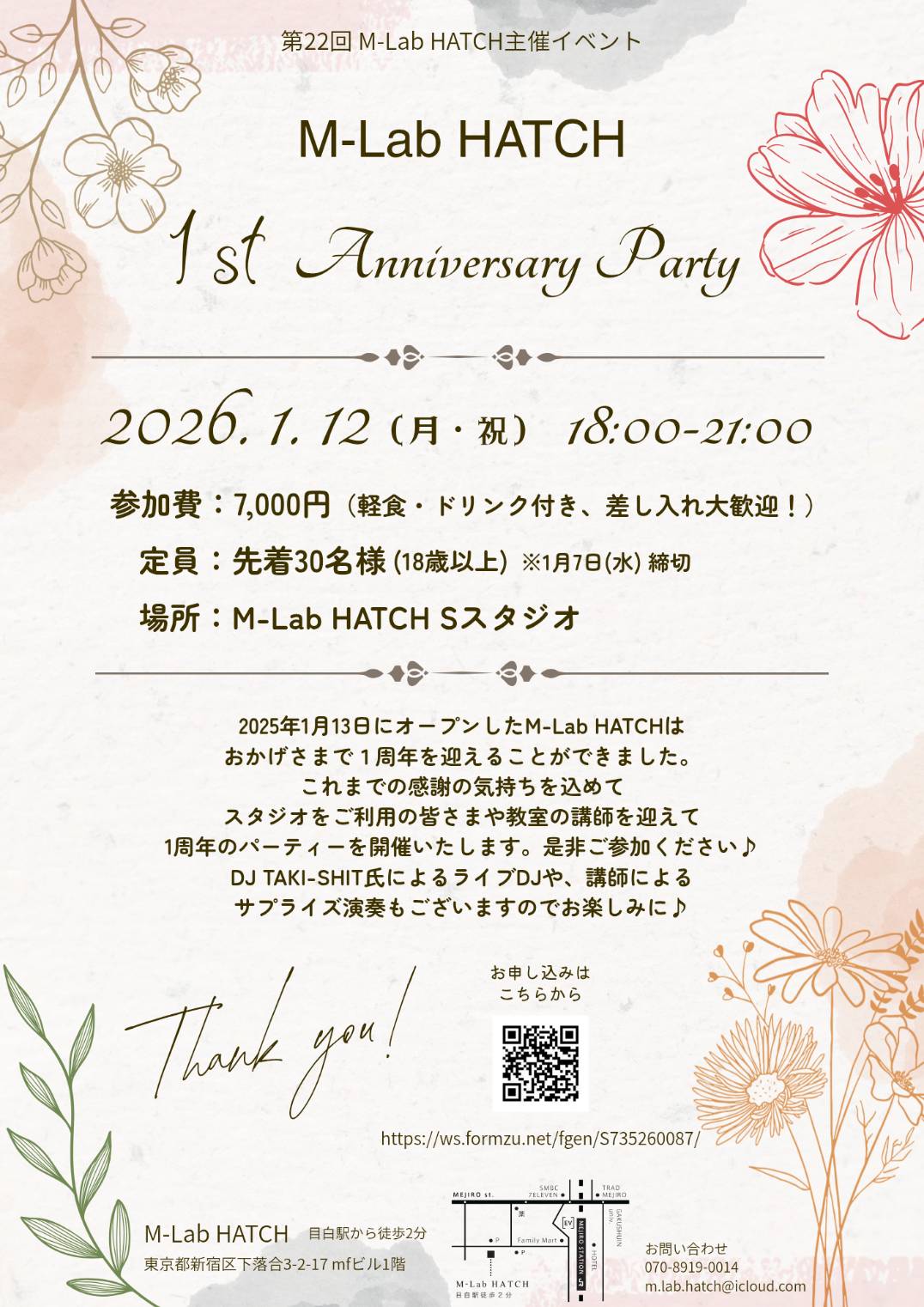 これまでの感謝の気持ちを込めて、スタジオをご利用の皆さまや教室の講師を迎えて1周年のパーティーを開催します。是非、ご参加ください!