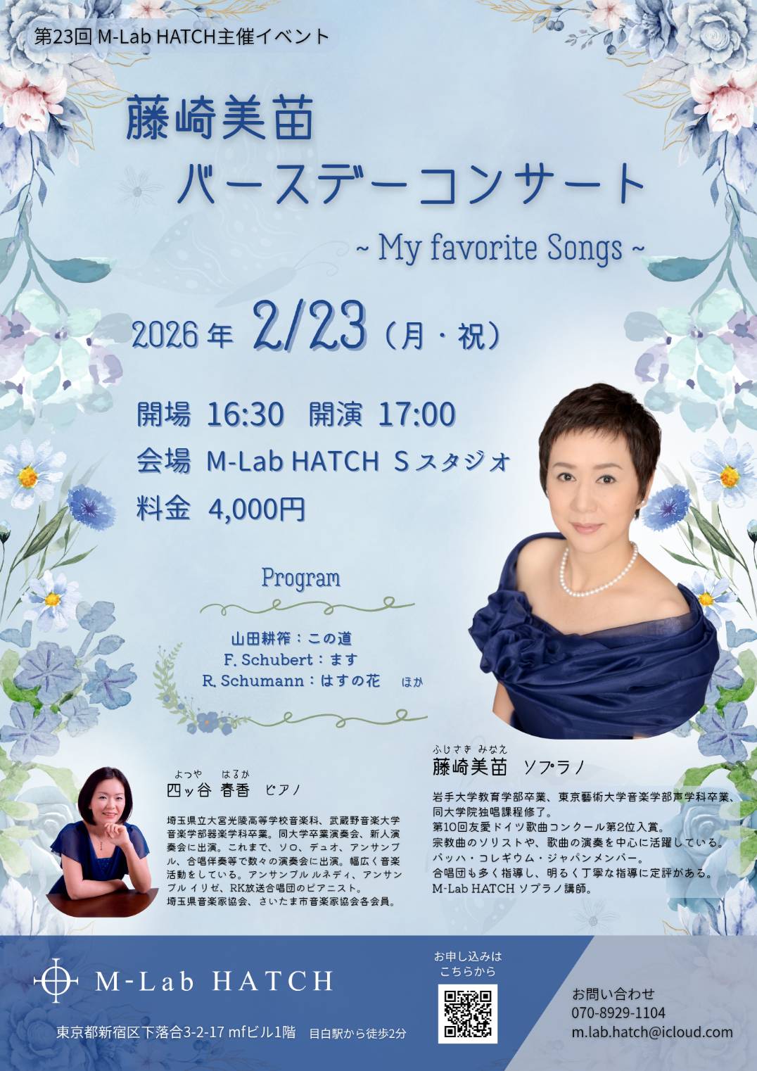 第23回 M-Lab HATCH 主催イベントは、エムラボ・ハッチのソプラノ講師の藤崎美苗(ふじさき みなえ)さんのバースデーコンサートです。お祝いに、ご友人の四ツ谷春香(よつや はるか)さんがピアノでご出演くださいます。