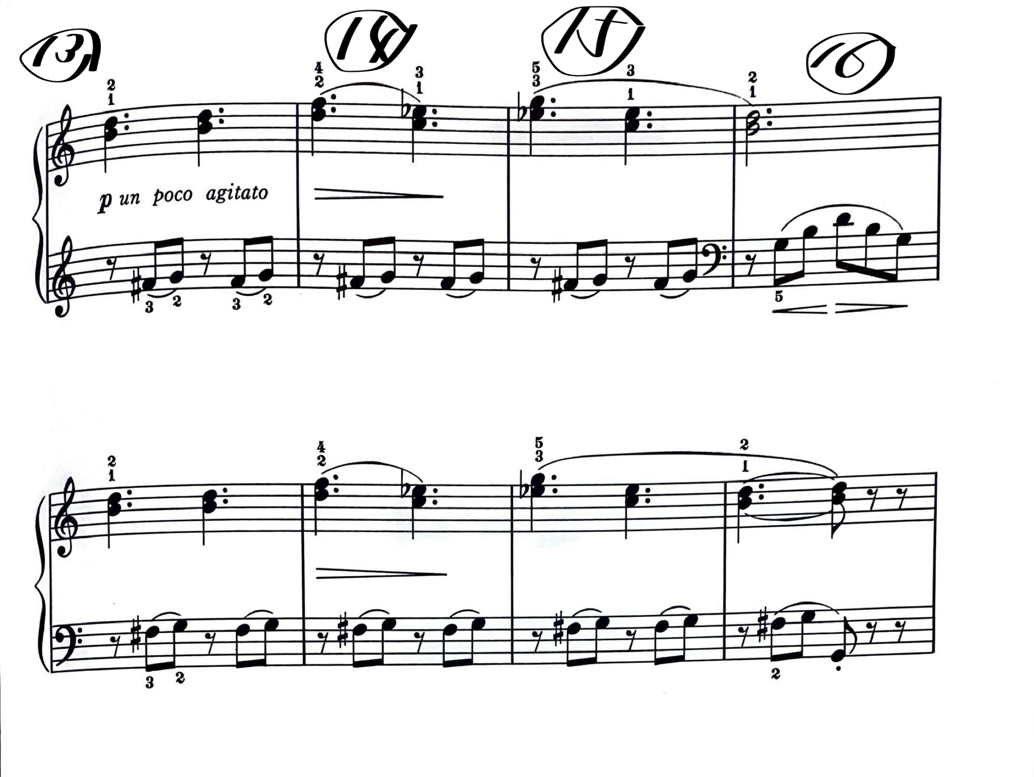 3度はなめらかにレガートで。15小節目は跳躍進行で難しいので、5(ソ)3(ミ♭)のソプラノだけ残してレガートにしましょう。16小節目も下の音が1・1と続くので同様に。